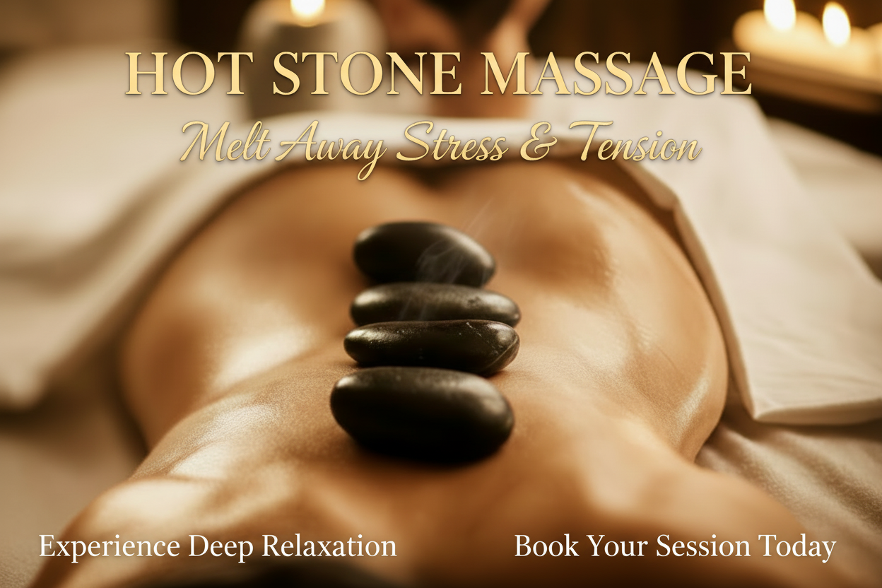 Hot Stone Massage; 60 minute service This massage is warm and relaxing. Hot stones used along the whole body. Along with slow long flowing massage strokes to calm your body and ease your mind.